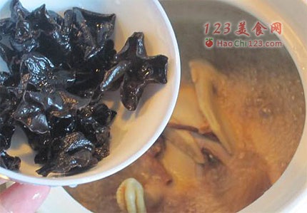 6、加入事先浸泡好的茶树菇和黑木耳和一小块冰糖再煲半个小时即可。