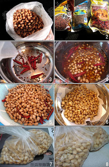 4、5-6图,捞出花生米,去皮,用厨房纸巾擦净表面水分(我看了3集电视剧才剥完皮儿)。