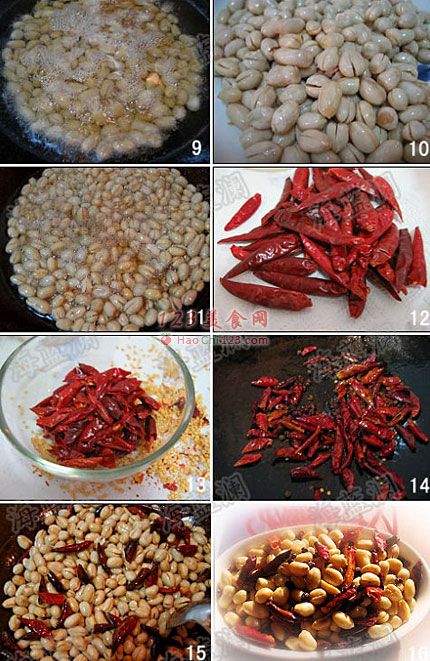 6、9-10图,锅内把油烧温热,倒入冷冻的花生米,中小火慢慢炸至花生米向上漂,锅内有哗哗的响动捞出。