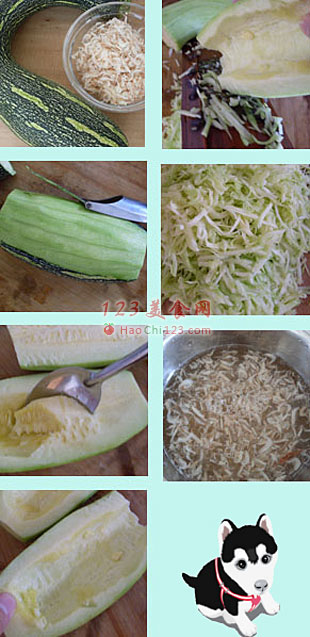 2、将小倭瓜洗净,用刮皮器刮去外皮,对半切开,用勺子挖出瓜瓤不要。