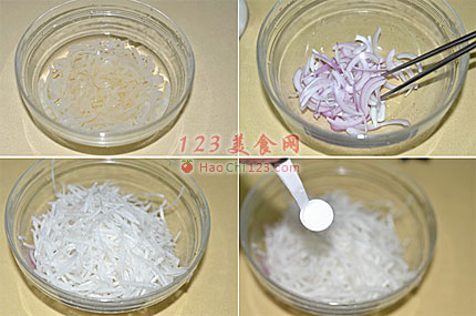 3、将洋葱腌出的汁倒掉,用清水洗干净控干水份,将萝卜擦成细丝跟洋葱丝放在一起。