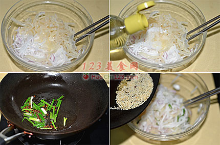 8、将白芝麻放在热油中,炸至微黄有香味时,趁热浇在海蜇萝卜丝,拌匀即可。