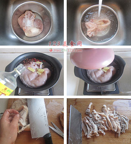2、猪肚加入大料和适量的白酒,帮助去异味;并加入点盐入底味;炖煮四十分钟,让猪肚九成熟;煮熟后拿出来再将里面白色的膜去除干净,这样处理好的猪肚切成条备用。