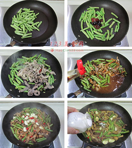 7、烧热锅,放少许油,下入四季豆翻炒。