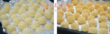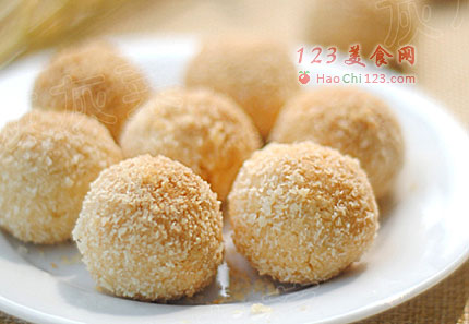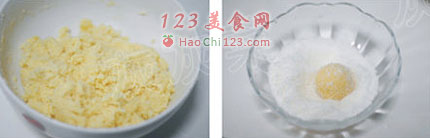 7、将面团揉搓成小球并在外面裹上椰蓉(另取的椰蓉)。