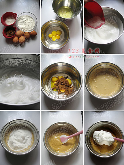 4、蛋白糊和蛋黄糊混合时,搅拌的手法要从底部往上翻拌,不要划圈搅拌,以免蛋白消泡。[sushi.laoyanhuo.com]