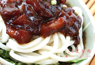 1、这酱熬好了第二步就是煮面条了,锅里放水烧开,水开后放一小勺食盐,然后放入面条,当水再沸腾的时候加少许冷水继续煮(如此反复三到四次,等到水最后沸腾的时候面条基本就熟了),这样煮出的面条爽滑劲道,非常好吃,面条煮好以后过两遍冷水。