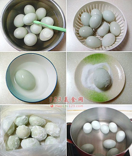 4、再放到细盐里滚一圈,让鸭蛋沾满细盐。