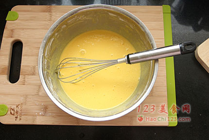 2、鸡蛋磕入料理盆中打散,用打蛋器搅拌均匀,加入玉米淀粉和食盐继续搅打,直至蛋糊细腻光滑,无任何颗粒。