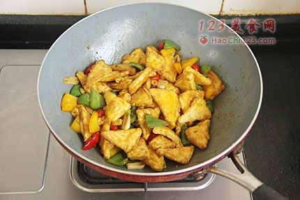 9、放入炸好的豆腐,用大火迅速炒匀即可关火。
