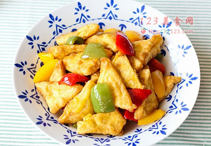 5、豆腐是一种高营养、高矿物质、低脂肪的食品,有“植物肉”之称。它是植物食品中蛋白质比较高的,含有8种氨基酸,具有益气、补虚的功效。豆腐味甘微寒,能补脾益胃,清热润燥,利小便,解热毒。甜椒营养价值高,富含维生素B、维生素C、胡萝卜素,具有促进消化、脂肪代谢等功效。它能增强体力,缓解因工作、生活压力造成的疲劳。它特有的味道和所含的辣椒素能刺激唾液和胃液分泌的作用,能增进食欲、帮助消化、促进肠蠕动、防止便秘。由于维生素C含量高,甜椒还能防治坏血病,对牙龈出血、贫血和血管脆弱有辅助治疗作用。[sushi.laoyanhuo.com]