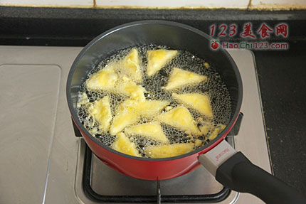 3、小汤锅内倒入适量花生油烧至五成热。将豆腐片依次挂糊,放入油锅中用中火炸制。