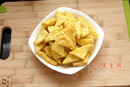 2、调糊时加入鸡蛋可防止炸好的豆腐口感太硬,还能补充营养,为豆腐增色,一举多得。