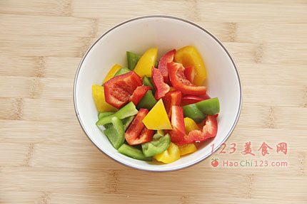 5、红黄绿甜椒分别洗净,去蒂去籽,切成小块。