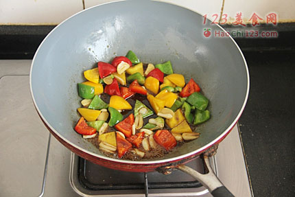 8、炒锅上火,倒入少许油烧热,下蒜片煸炒出香味。加入红黄绿甜椒翻炒几下,调入锅包汁拌炒均匀。