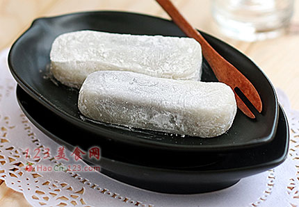 16、麻糬模具扑少量玉米淀粉,将包好的粉团压入模具中,送入冰箱冷藏30分钟后磕出即可。