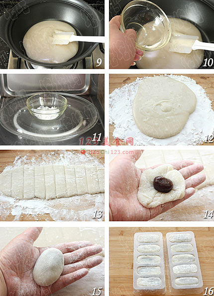 14、手上抹玉米淀粉,取一小块粉团按扁,然后中间放上15克搓圆的红豆沙馅。