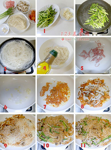 8、放入肉丝和芦笋,加入1/2茶匙盐,炒匀即可出锅。