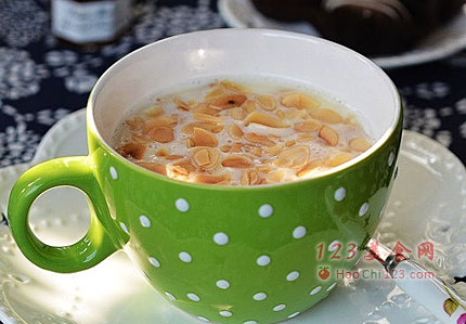7、煮好倒入杯中,加上烤好的杏仁片即可。