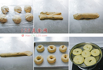 2、最后发酵时烤盘上垫油布(或湿布)可避免面团粘连,防止贝果沾在烤盘上取不下来。