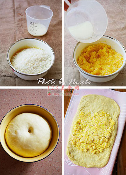 8、面团排气,松弛10分钟,擀成长方形,在中间铺上椰蓉馅。