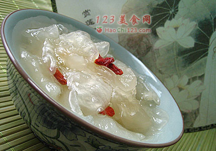 4、把枸杞、银耳、雪梨、冰糖一同放入锅中,加适量水,大火煮开,然后转小火煮40分钟-1小时左右即可。另外由于雪花梨比较容易煮熟,所以不喜欢吃太软的也可以后放入锅内。