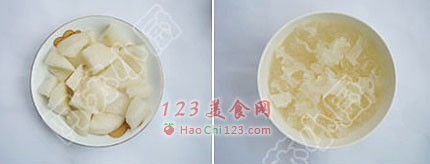 2、雪花梨洗干净,去皮去核。切成小块备用。
