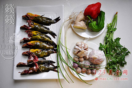 3、将蒜坨和独蒜去皮。将其它的辅料进行处理:青红椒洗净去蒂去籽切块,生姜切大粒(与蒜瓣大小)。小葱洗净切段,香菜洗净掐成小段备用。