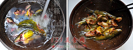 5、待香辛料煎至表皮焦黄出香,将腌制好的黄腊丁平铺在煎香后的香辛料上,加盖慢火焗制约3分钟左右时,揭盖淋一圈料酒(1汤匙)。