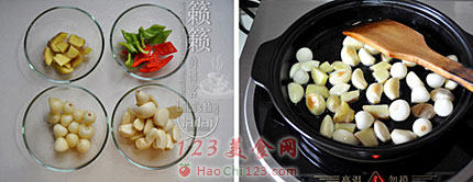 4、准备好浅口砂锅,将生姜粒、蒜瓣和小独蒜平铺在砂锅底,沿砂锅锅边浇淋一圈花生油,使油薄薄地布满砂锅锅底,将砂锅置于灶上慢火煎制。
