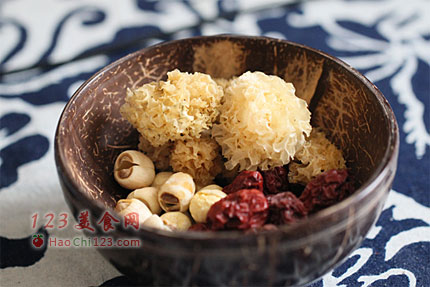3、银耳提前半天泡发,洗净撕小块沥水待用。
