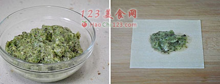 3、再加入盐跟一点点五香粉拌匀,然后挖一小勺馅料放在馄饨皮中间(五香粉加一点点就行,会让馄饨更好吃。不加五香粉馄饨味道不精彩,加多了则是败笔)。