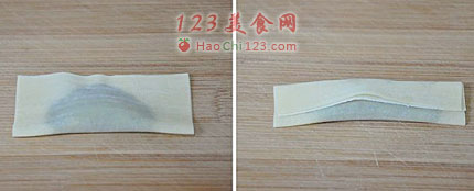 4、将馄饨皮向外对折,然后拉起皮的边缘再向里对折。