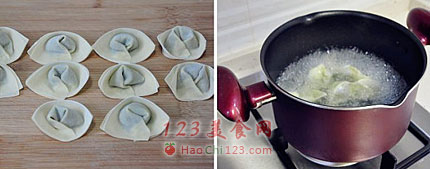6、锅中水开后放入馄饨,煮至全部漂浮即可捞出(馄饨不易煮的时间太长,看到馄饨皮全部变色即可捞出,否则会煮散烂)。