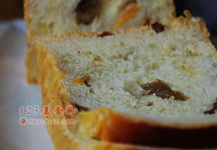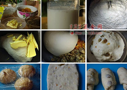 2、除橙皮和葡萄干之外的所有材料扔进面包机,两个生面团程序揉至可以拉出有筋度的薄膜,然后加入糖渍橙皮和挤干水份的葡萄干,继续搅拌几分钟拌匀即可。