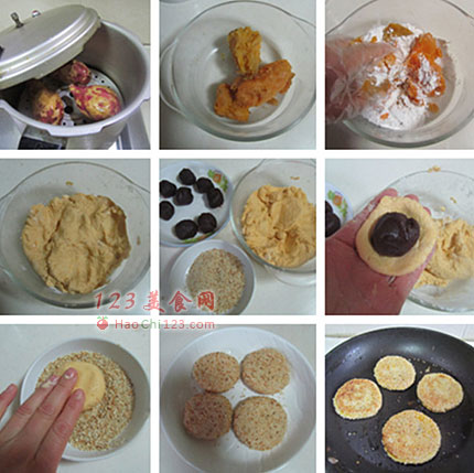 6、喜欢吃红薯,特别是红心的那种,就用它来做个“芝麻红薯豆沙饼”。红薯和米面搭配着吃,还能起到蛋白质的互补作用。以红薯与糯米粉混合成面团做皮儿,红豆沙做馅,软糯香甜,色泽诱人,很适合做早餐,当然也很适合做点心,既美味又健康养生。[sushi.laoyanhuo.com]