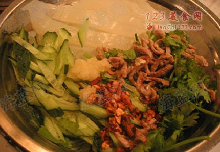 2、炸熟花生粒几粒,晾凉撵碎。独头蒜一个压成泥。两勺麻酱用淡盐水化开。