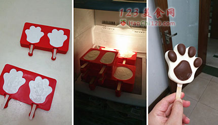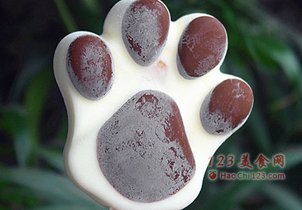 2、笑脸的巧克力装饰在雪糕冻好脱模后,在眼睛和嘴巴里直接挤入巧克力酱就可以了。
