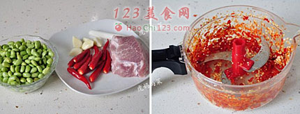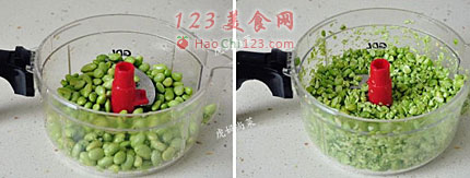 3、洗净的毛豆放入切菜器切碎,稍转几圈就行,不用切太碎,这样吃起来才满口生香的有嚼头。