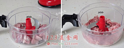 2、梅花肉切成小块后放入切菜器,转一转搅打切碎成肉末。
