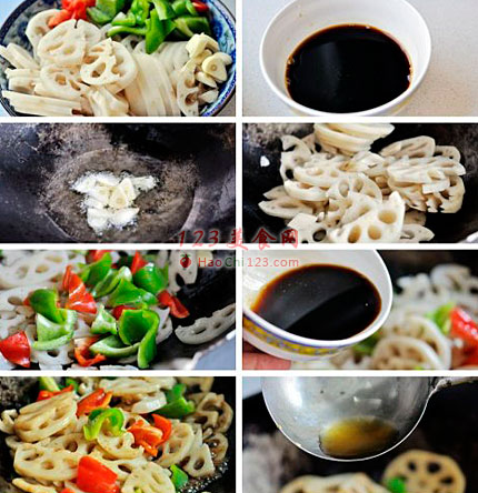 3、开中火,炒锅倒底油,放蒜片炒香,加莲藕片翻炒。