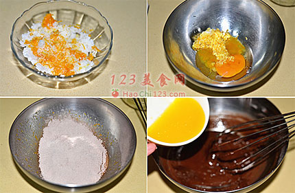 3、低筋面粉,可可粉,泡打粉混合均匀过筛至蛋糊中。