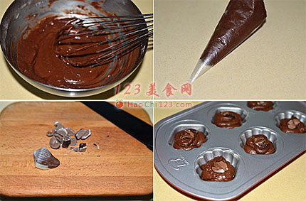 8、模具刷薄薄一层黄油,挤入面糊约8分满,表面放2块切小的牛奶巧克力块。