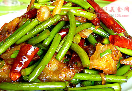 9、改为大火加少许生抽、糖、鸡精、少许肉汤不停的翻炒,等蒜薹表皮起皱起锅即可。