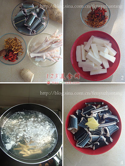 4、洗净蛇和鸡爪表面的浮沫,余下的姜片备好。