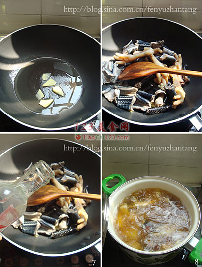 3、锅里下水烧开,调入2片姜和1汤匙广东米酒,然后把洗净的蛇和鸡爪放入焯水3分钟。
