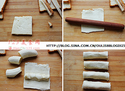 2、吐司面包包馅之前先用擀面杖擀压一下,这样吐司片就会变得熨帖,容易操作。