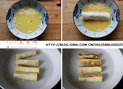 3、鸡蛋打散,将吐司卷放入沾满蛋液。