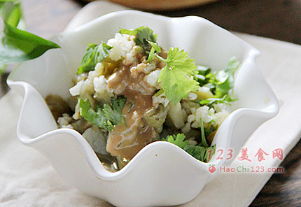 12、放入小碗中,加入蒜碎和香菜再浇上酱汁即可。
