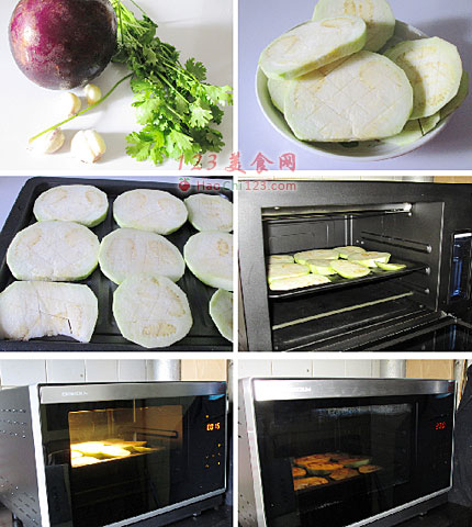 3、将茄子片,均匀的码放在烤盘上。